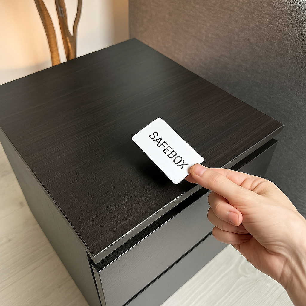 Approche la carte SAFEBOX du couvercle – un signal sonore confirme le déverrouillage immédiat.