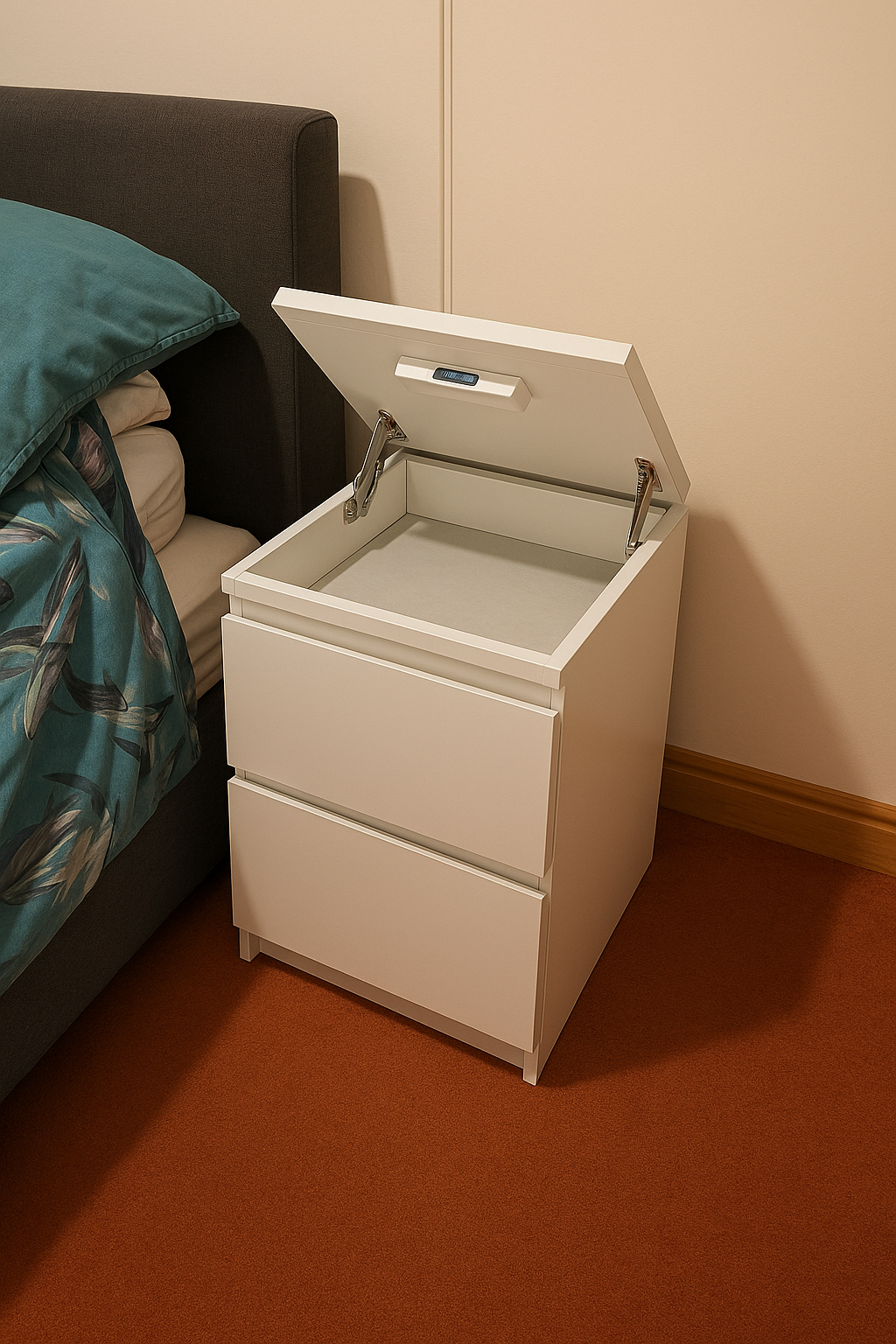 SAFEBOX associe la haute technologie dissimulée à un design de mobilier élégant – une table de nuit qui s’intègre harmonieusement dans toute chambre à coucher. Les matériaux nobles et le langage des formes épurées la rendent non seulement sûre, mais aussi un véritable accroche-regard avec une fonction discrète
